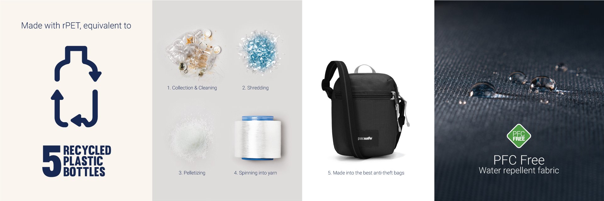 This product is made with post-consumer recycled polyester (rPET), equivalent to 5 recycled plastic bottles, and is treated with a 100% PFC-free water repellency.