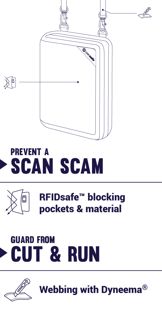 The organizer comes with a detachable cut-resistant security strap made with Dyneema® for added protection. For extra security, especially if you prefer to wear the wallet as a crossbody, we recommend purchasing the Pacsafe® Cut Resistant Lanyard with TurnNLock security hook. This option provides an additional layer of security and peace of mind.
