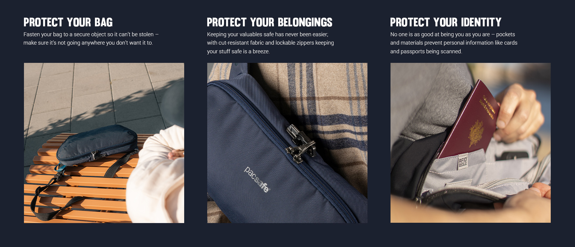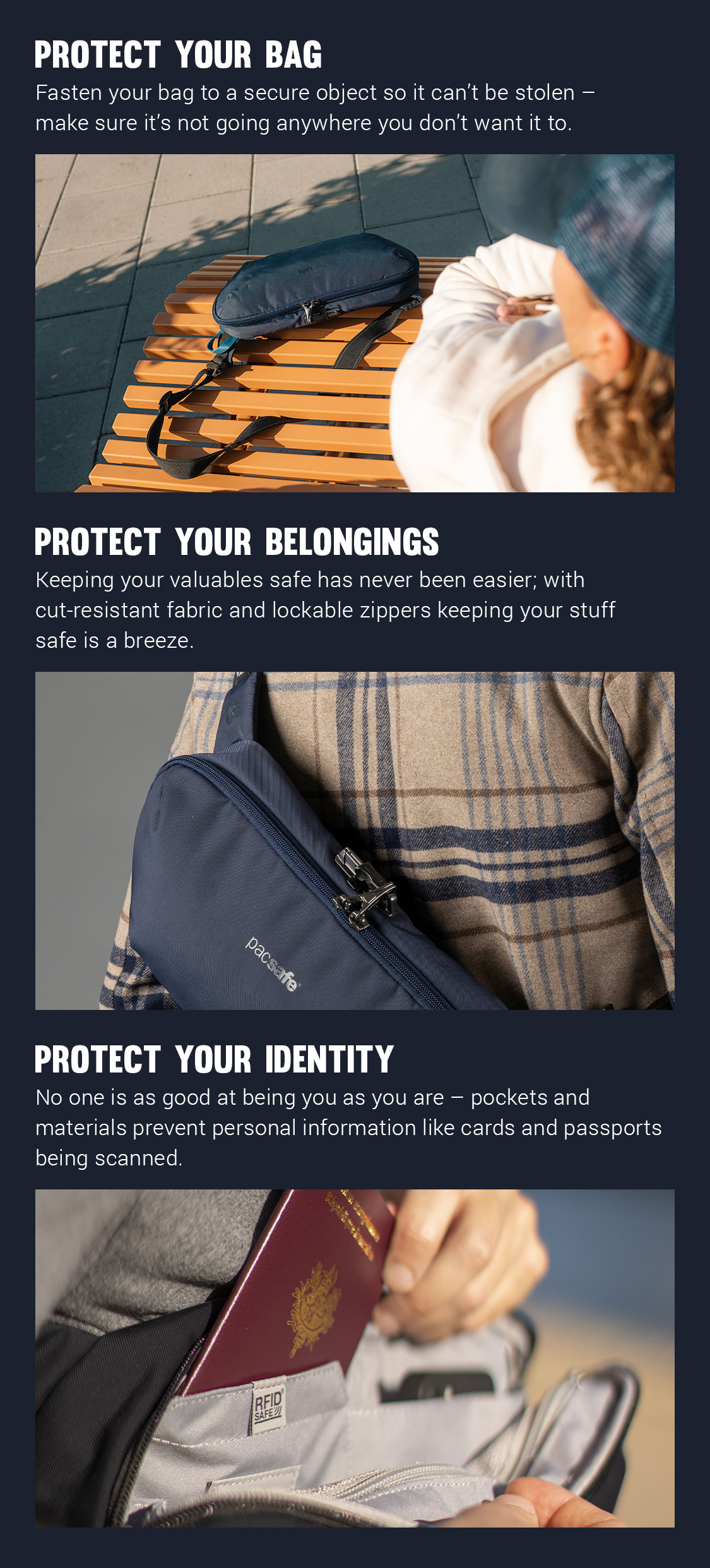 這是至今最好的斜孭袋。配備標誌性的 Pacsafe 防盜功能﹙如防𠝹eXomesh®裡布、可鎖拉鏈、RFID 屏蔽口袋和防𠝹肩帶﹚,保護您的袋、貴重物品和個人身份的安全。 寬敞的袋口讓您可以輕鬆整理您的裝備,完善的間隔和口袋可存放您的所有必需品。靈活的設計使您可以將袋穿戴在背上、胸前、左肩或右肩上。