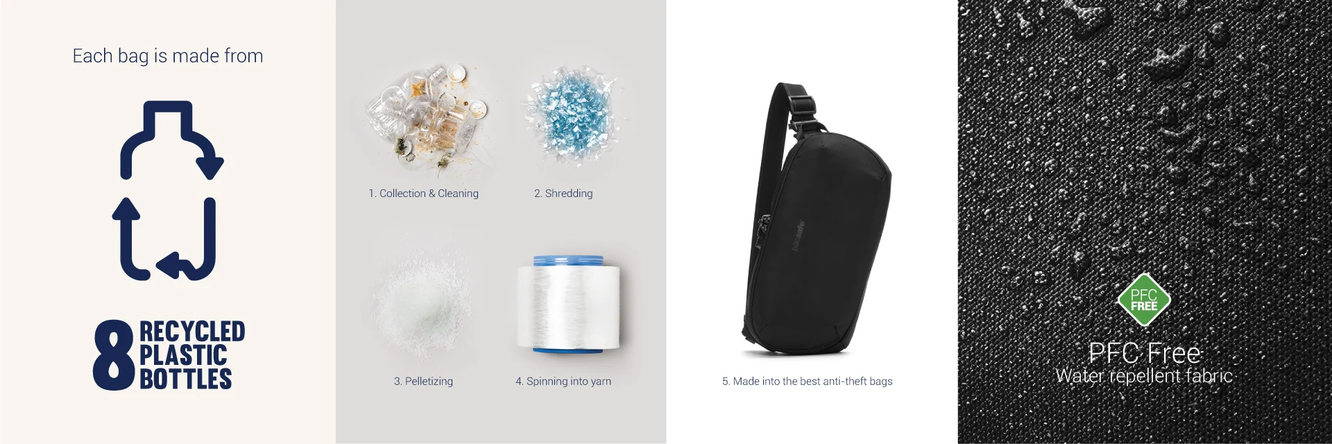 此產品原料皆來自 消費後回收的聚酯纖維(rPET, 再生聚酯),相等於8 個回收塑料膠樽, 經過100%無PFC防潑水處理