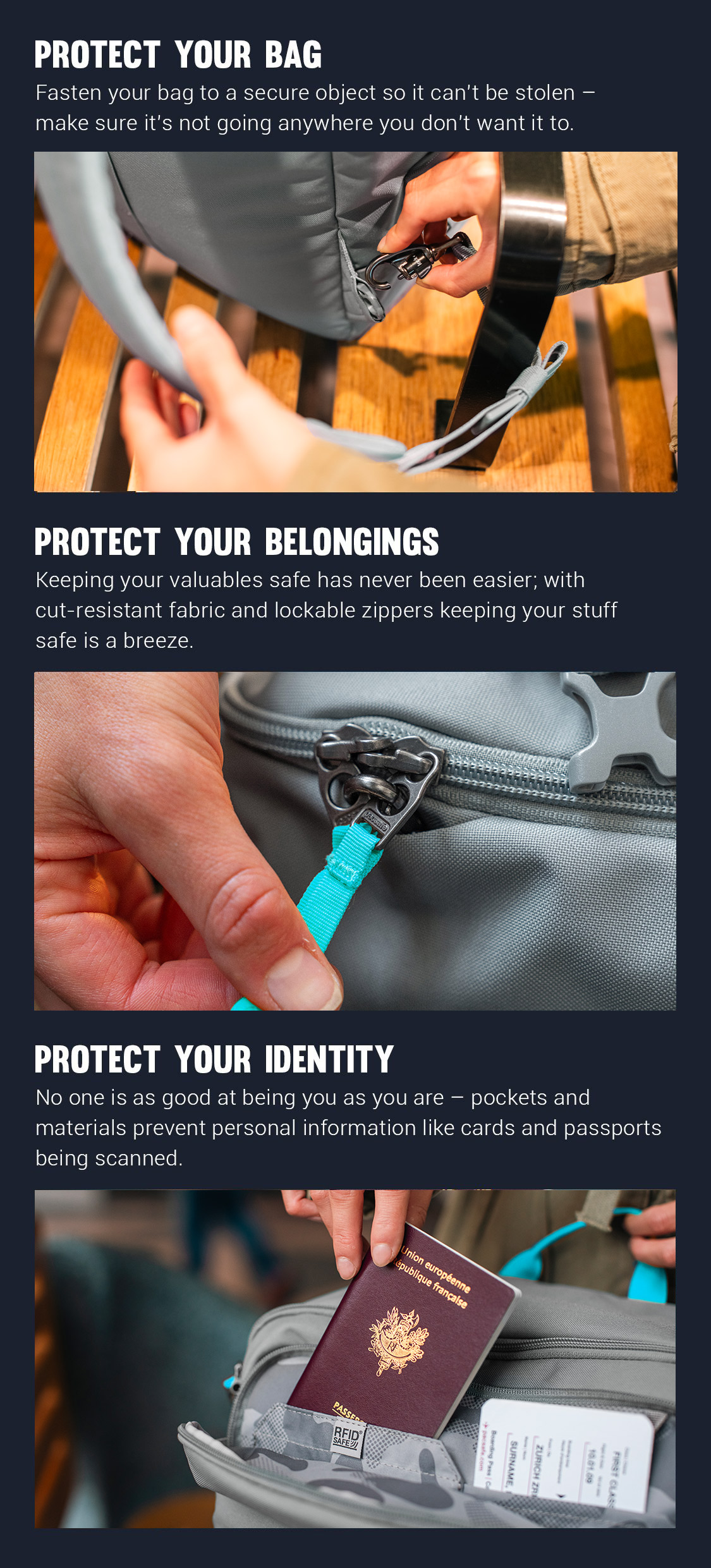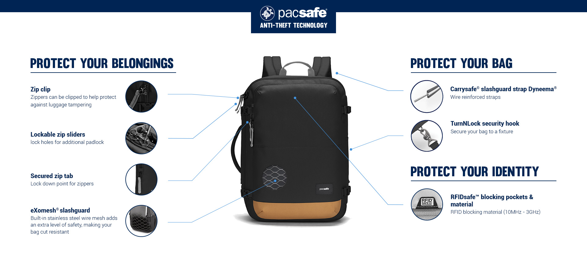 Great addition to our PacSafe bag collection! We needed a smaller backpack that offered a lot of room without traditional dividers. This bag is perfect for awkwardly shaped items you need to carry on, like size 15 men’s shoes, that don’t fit in a standard backpack well. Love the PacSafe products.
