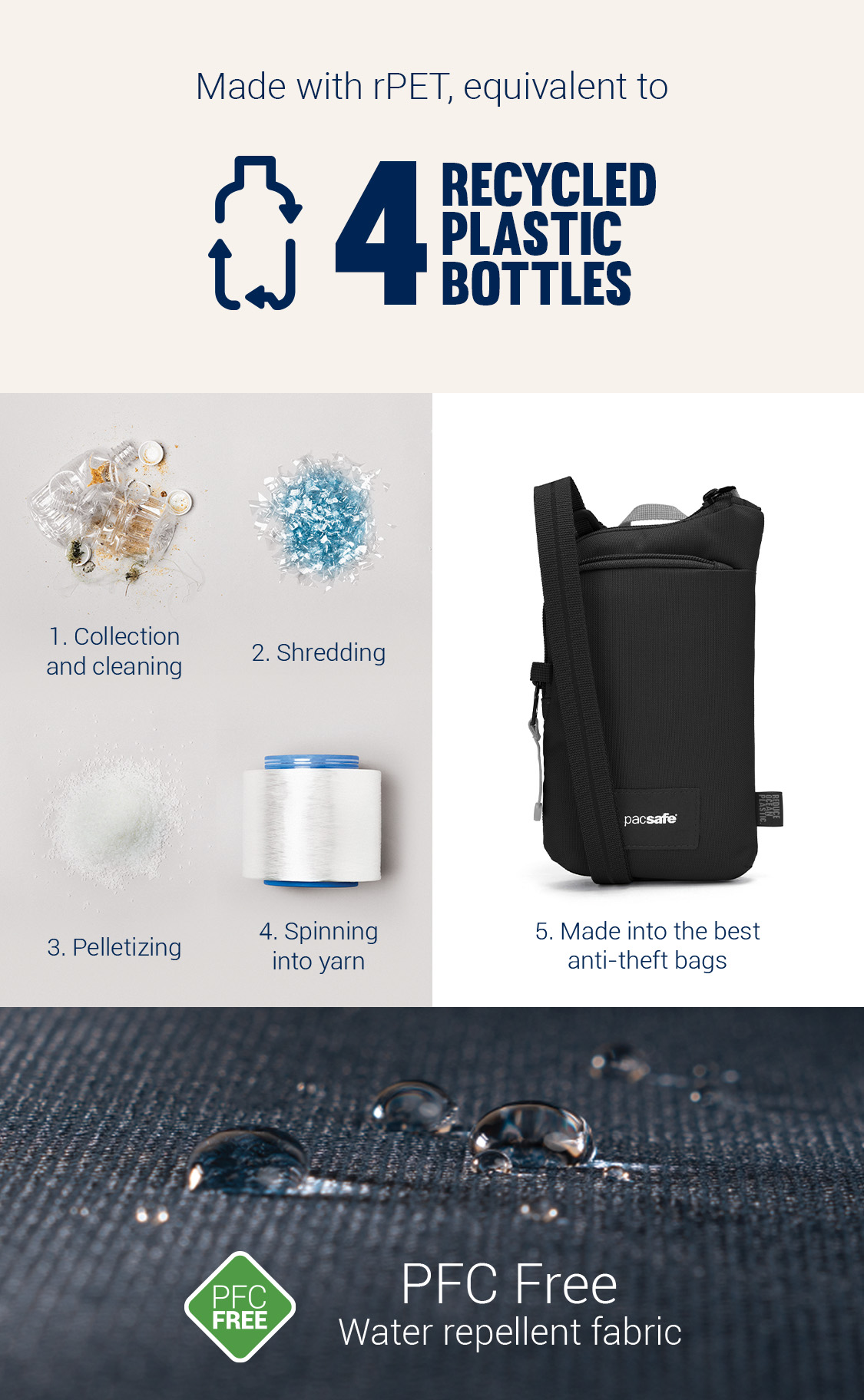 此產品原料皆來自 消費後回收的聚酯纖維(rPET, 再生聚酯),相等於4 個回收塑料膠樽, 經過100%無PFC防潑水處理