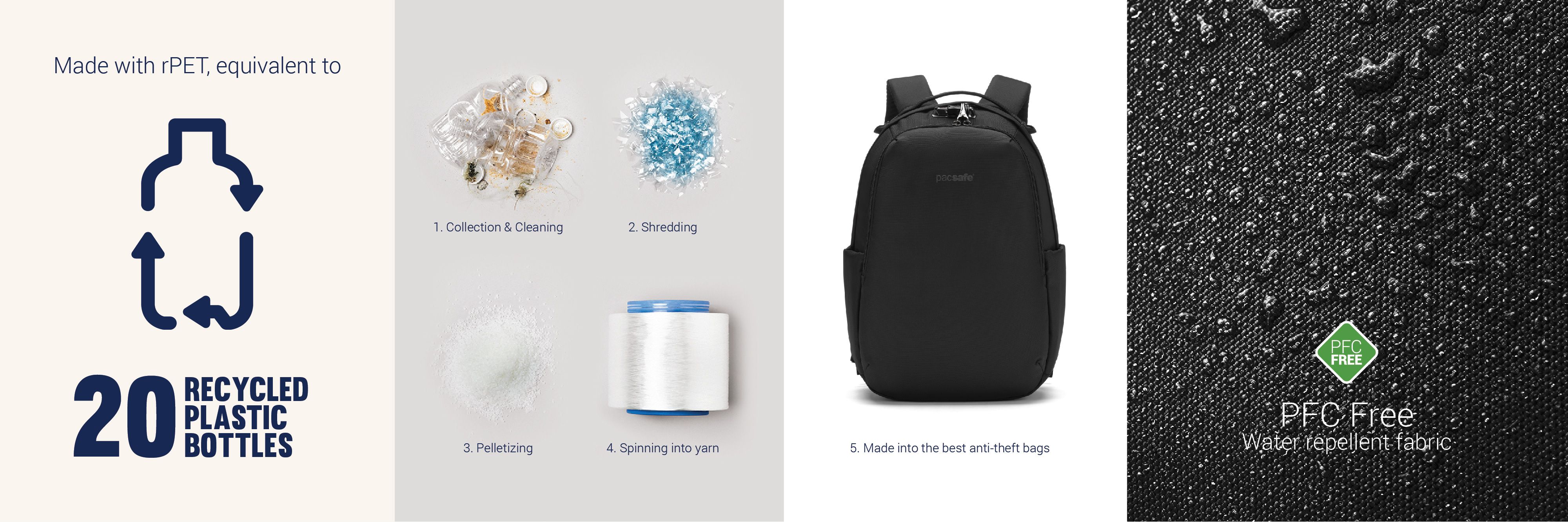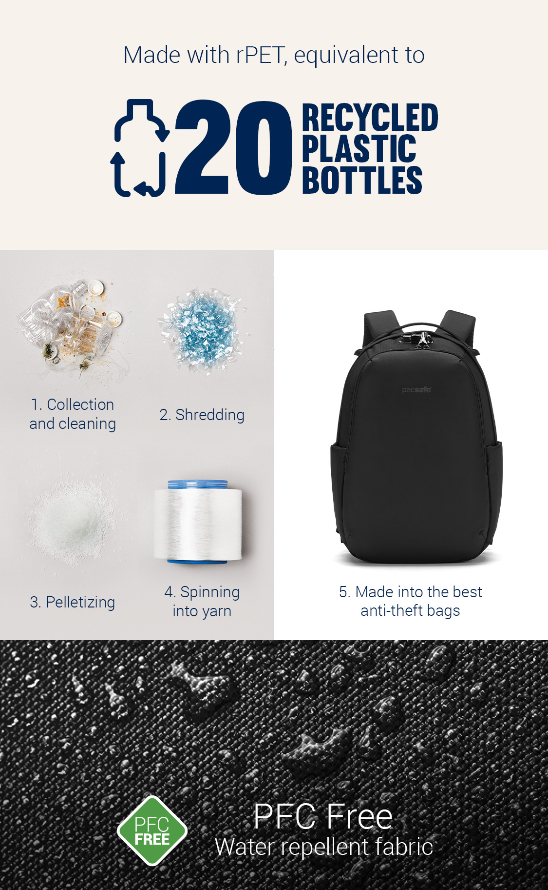 此產品原料皆來自 消費後回收的聚酯纖維(rPET, 再生聚酯),相等於20 個回收塑料膠樽, 經過100%無PFC防潑水處理