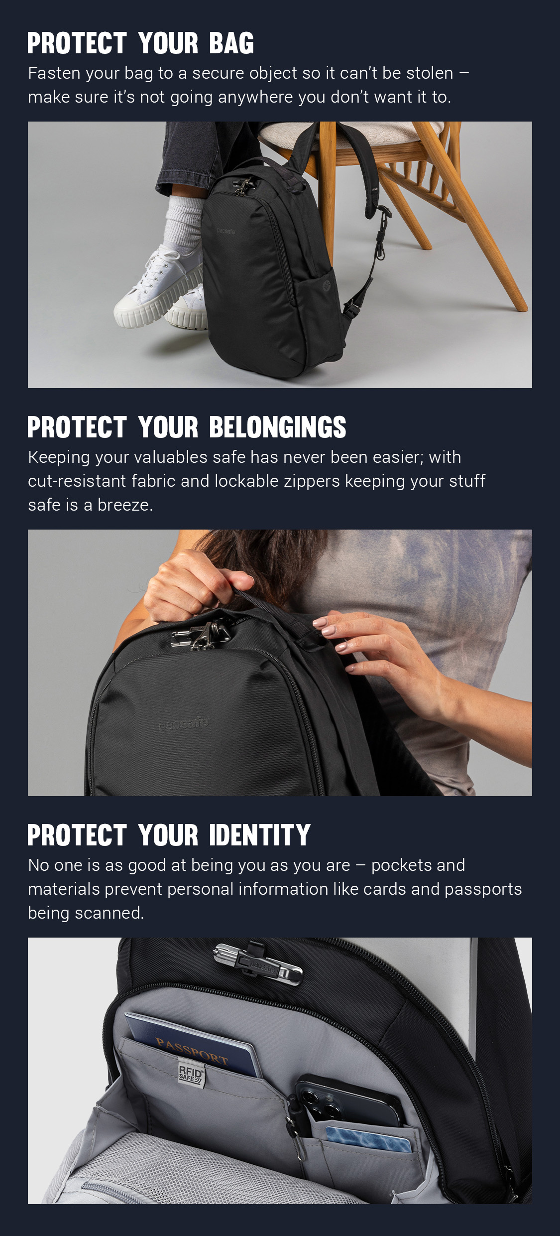 Anti theft features are great. Back pocket is useful, though a zipper garage would be enhance it.