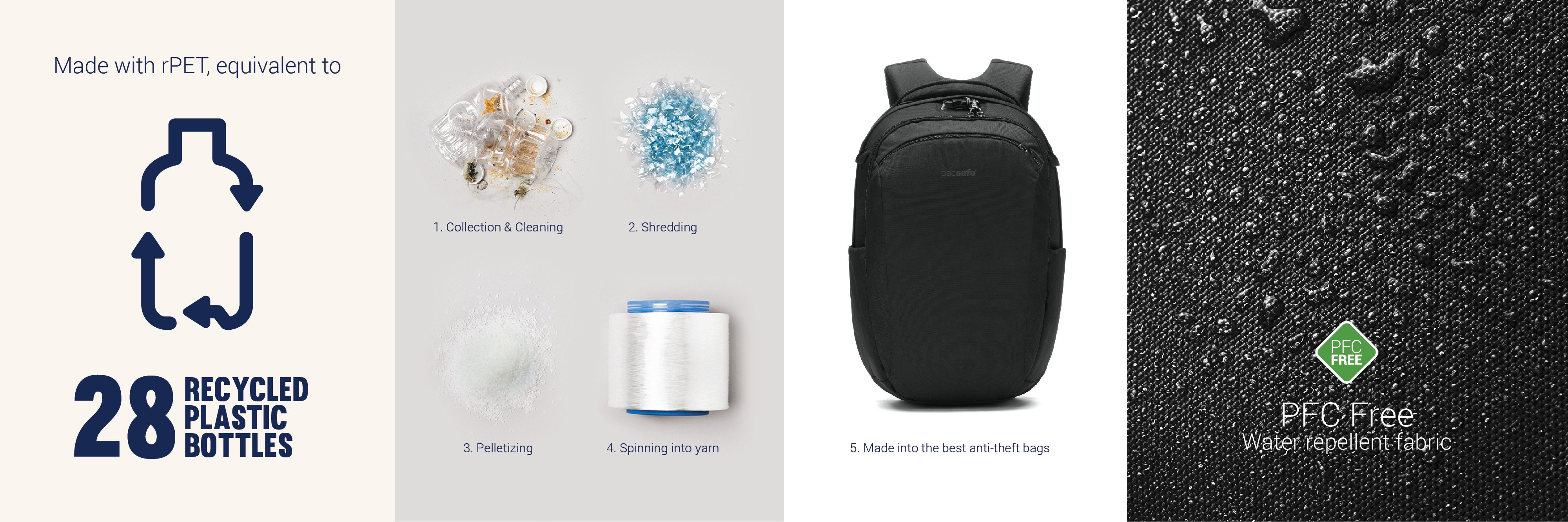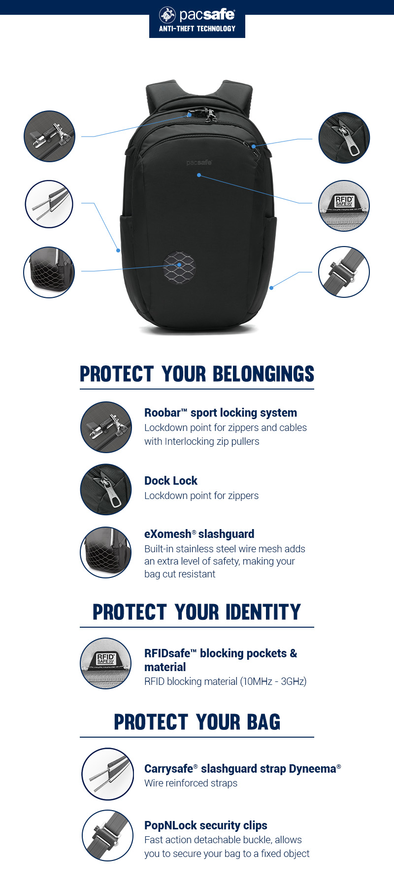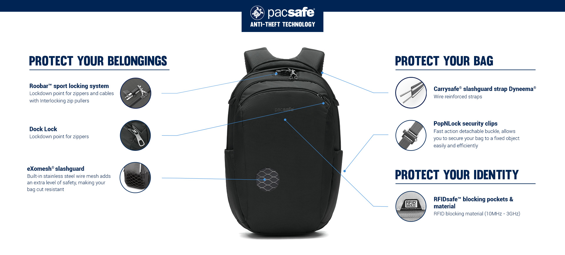 This backpack gets the best of both worlds — a perfect convergence of the Vibe and Metrosafe series. After carefully comparing reviews across Pacsafe’s older models, doing real life tests and skipping many sale of their aging and confusing models, I’m thrilled to say that this one finally includes the features users have been were either missing or not provided for: