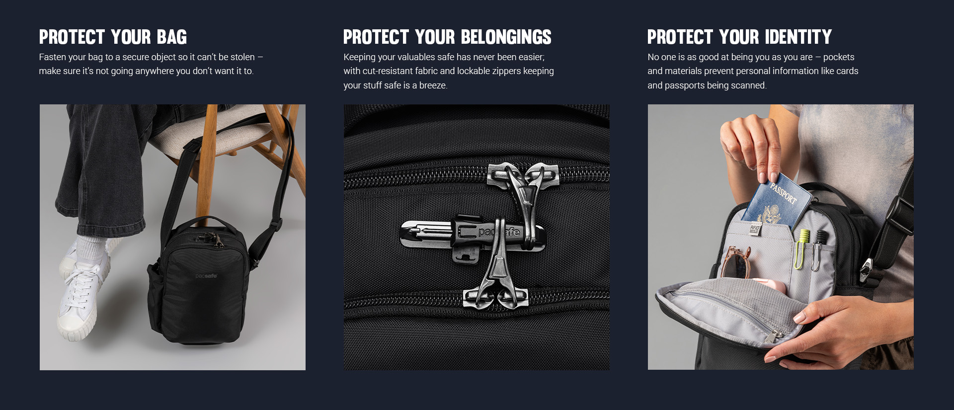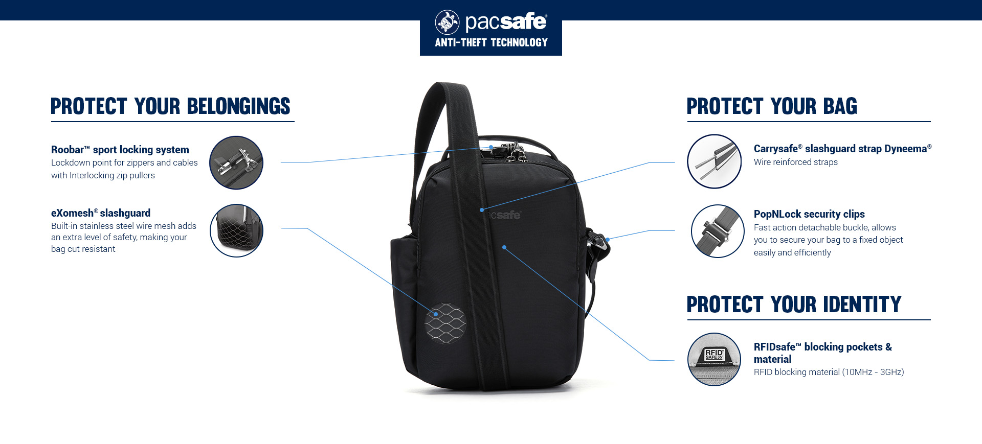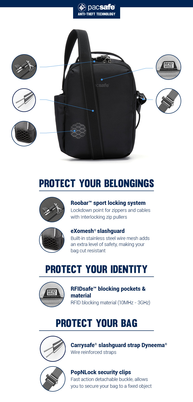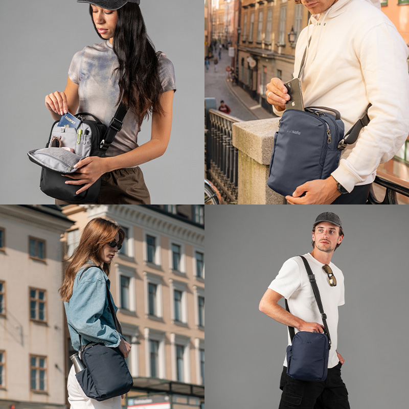Perfect size to carry multiple items for travel, an outing, a day trip. I can easily fit in an ipad mini 7, headphones, a charger, a notebook, 2 pens, keys, a bag of nots, a tiny water bottle, my wallet in the RFID section and clip on a medical EPI Pen - and still have room to spare. It's compact, great blue color - nice strap and a carry handle. Very pleased with my purchase!