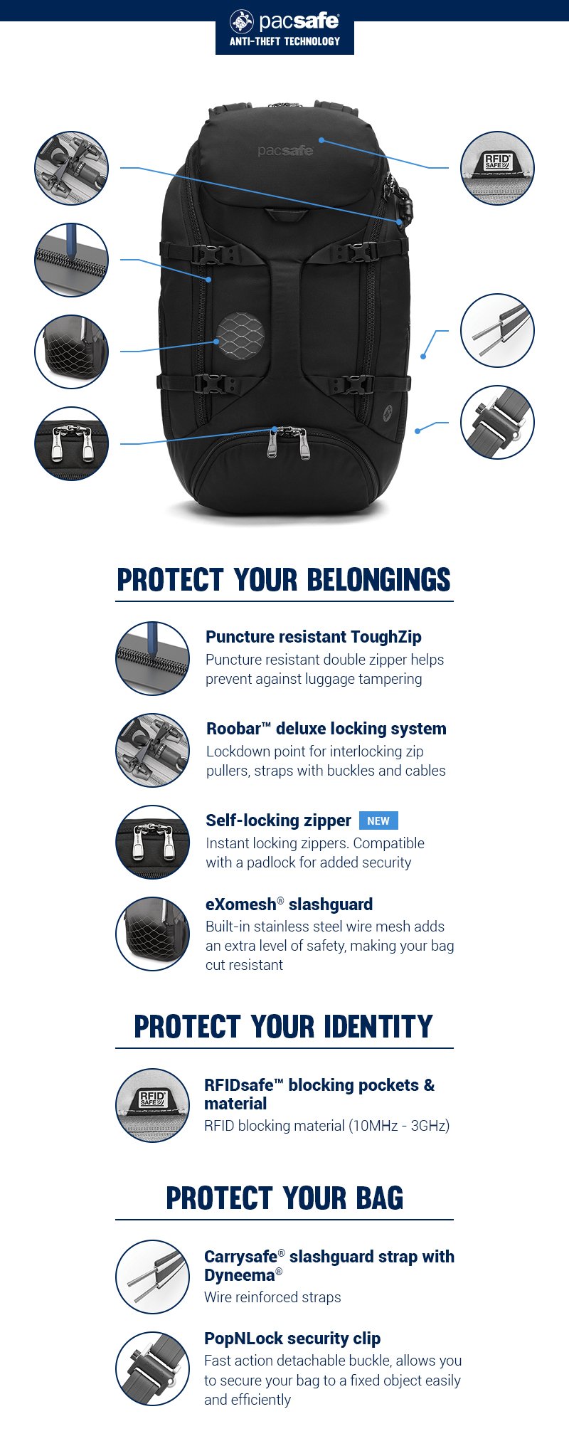 此配備最新的 Pacsafe 防盜技術自行鎖定拉鏈的背囊,讓您可自由自在地健身、旅行、工作和冒險。具有防𠝹物料、防刺穿拉鍊、RFID 屏蔽口袋和防𠝹肩帶,助您保護您的背囊、貴重物品和個人身份。這款 35L 的防盜背囊有一個設置在背部的可上鎖後間隔,可容納一部 16 英寸手提電腦。由37 個回收塑膠樽製成,經防潑水處理 ,100%不含 PFC,實為一個更具持續性的選擇。