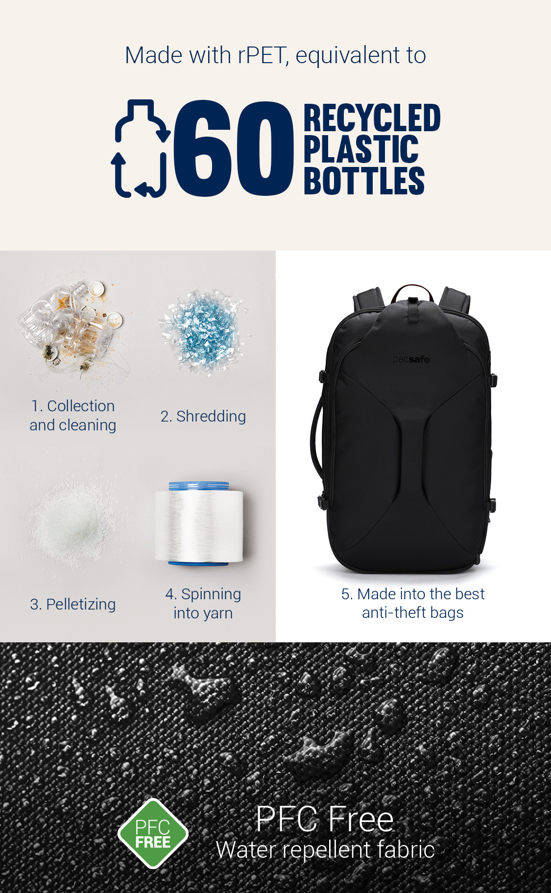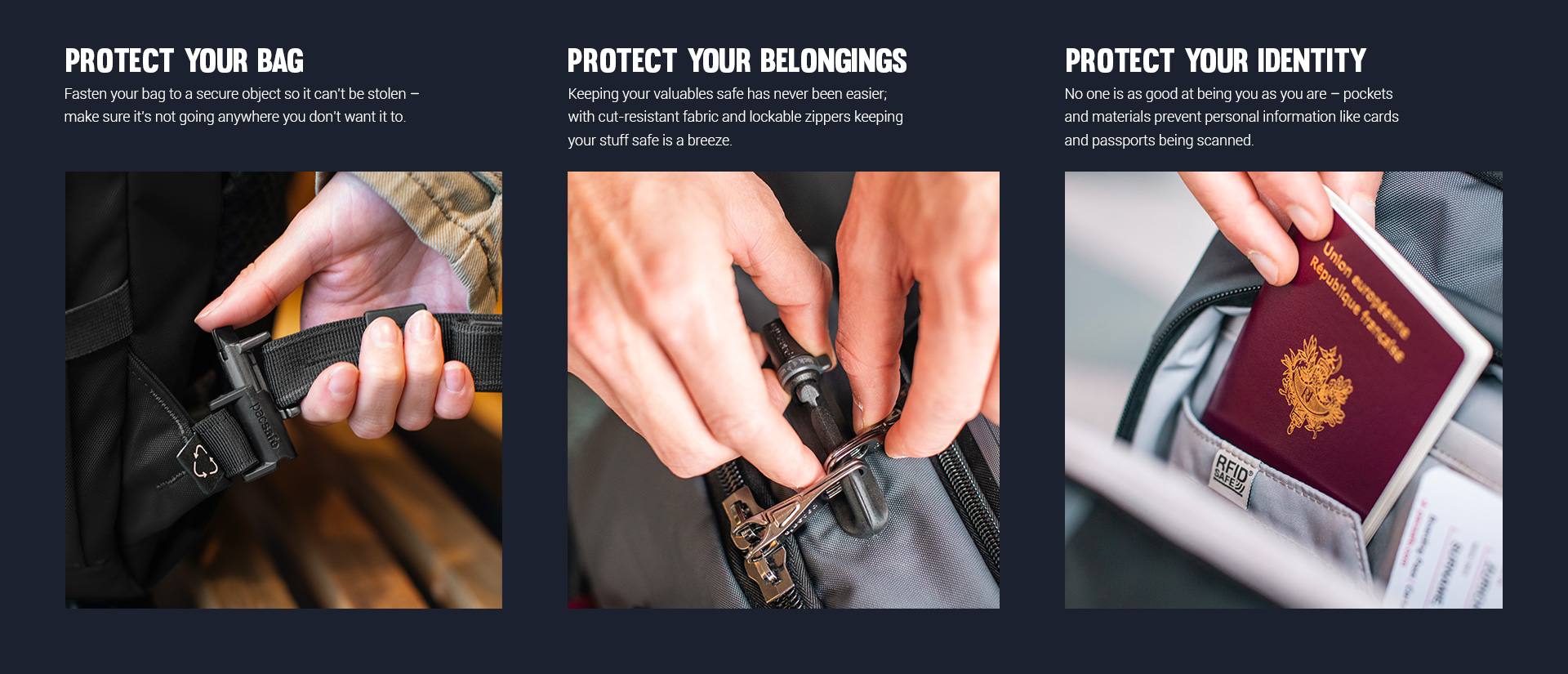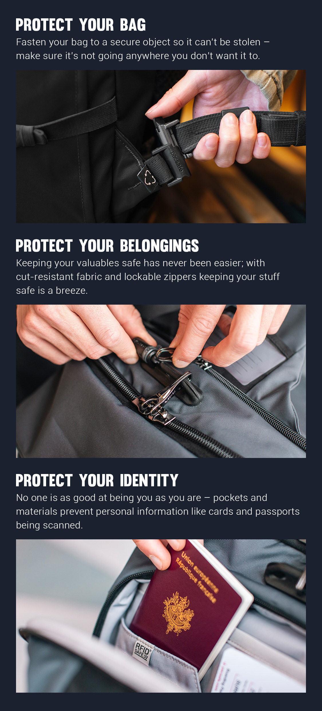 I like this bag. Well organized. Perfect for a couple of days or a week. I definitely like the materials. Very durable. I like the big open center space and tiedown straps. If I could improve one thing, I might have one external zipper pocket on the front of the bag. I understand this would conflict with the safety aspects that you tout.